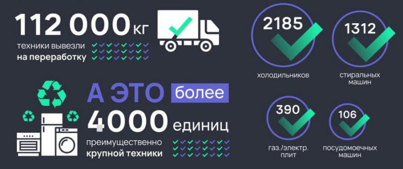 Интернет-магазин Холодильник.ру, продавец электроники и бытовой техники, и экотакси «Убери», провайдер сервиса, подвели итоги совместного экологического проекта в 2022 году. На утилизацию вывезено свыше 4000 единиц в основном крупной бытовой техники общим весом почти 112 000 кг. Клиенты интернет-магазина с помощью экотакси отправили в утиль 2185 холодильников, 1312 стиральных машин и 341 газовую плиту.